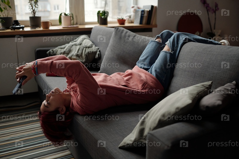 Девушка со смартфоном, лежащая на диване