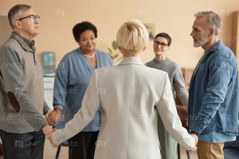 Обратный взгляд на женский терапевт, держащийся за руки с пожилыми людьми