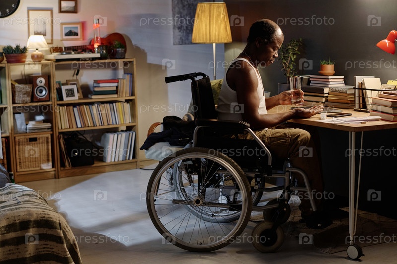 Зрелый афроамериканец с инвалидностью принимает свои ежедневные таблетки, сидя дома