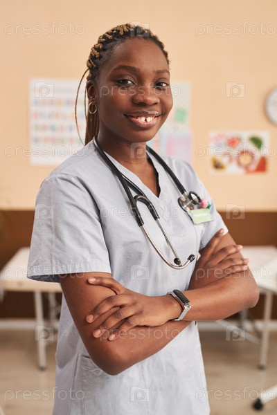 Черная медсестра улыбается на камеру, стоящая в клинике со скрещенными руками