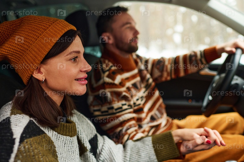 Веселая женщина и ее муж в машине