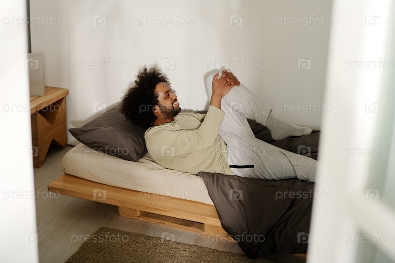 Счастливый молодой человек сгибает ногу в колене