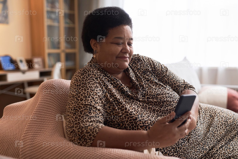 Чёрная старшая женщина, использующая телефон Расслабляясь на диване в уютном доме