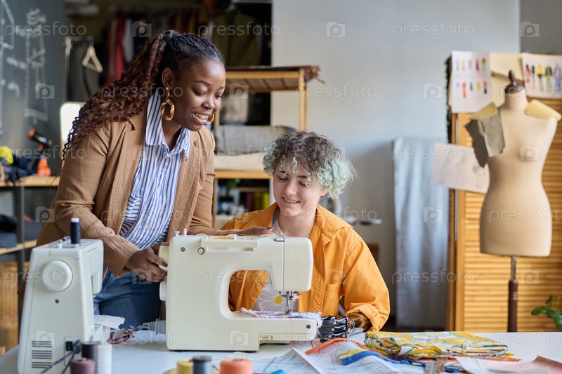 Улыбающаяся девочка-подросток с инвалидностью использует швейную машину в ателье