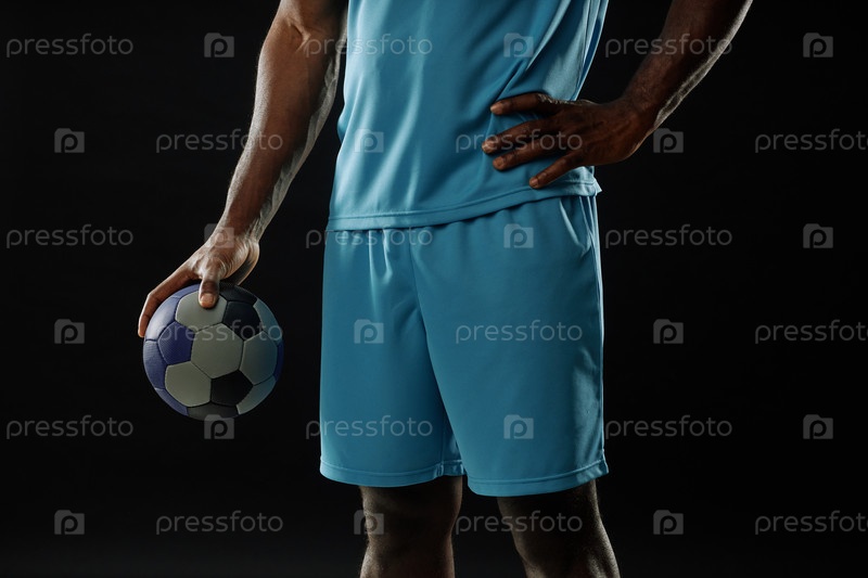 Футболист, держащий мяч и носящий синюю форму