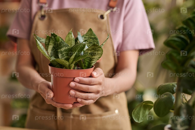 Продавщица, удерживающая горшочное декоративное растение