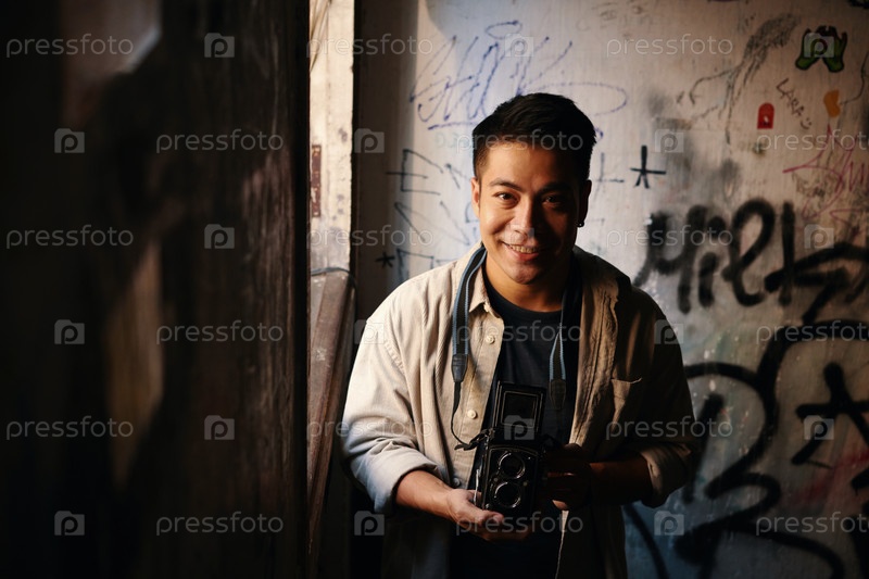 Веселый фотограф со старой камерой