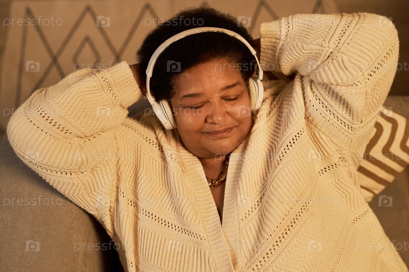 Чернокожая женщина слушает музыку с закрытыми глазами