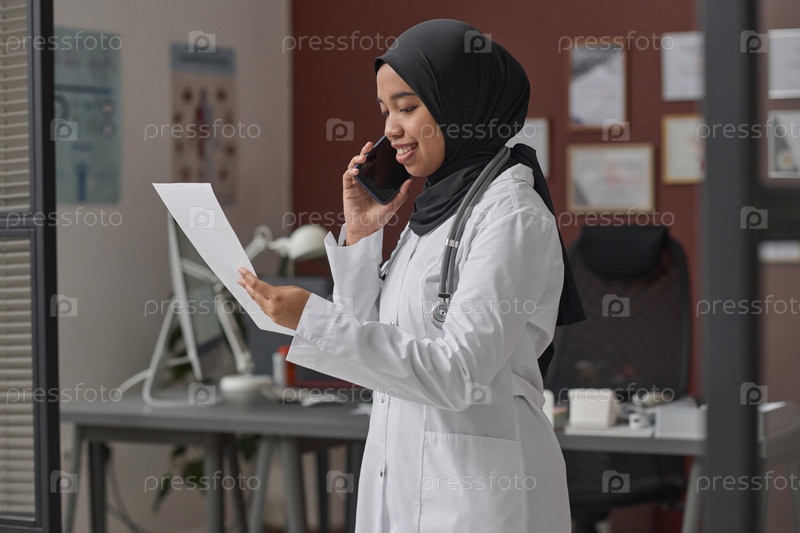 Мусульманская женщина-врач ведет телефонный разговор в своем кабинете в больнице