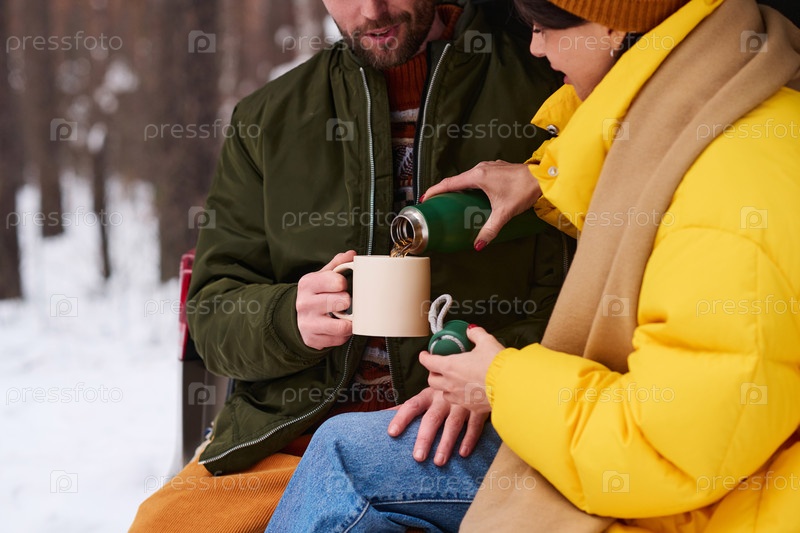 Женщина наливает горячий напиток в кружку для мужа