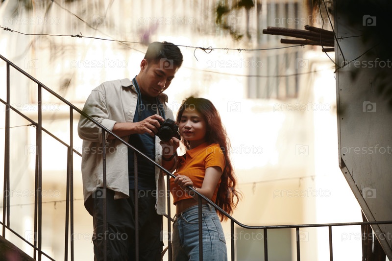 Фотограф показывает девушке экран фотокамеры