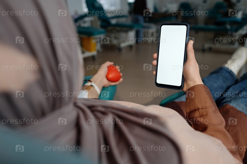 Посетитель клиники держит мобильный телефон с экраном макетов во время донорства крови