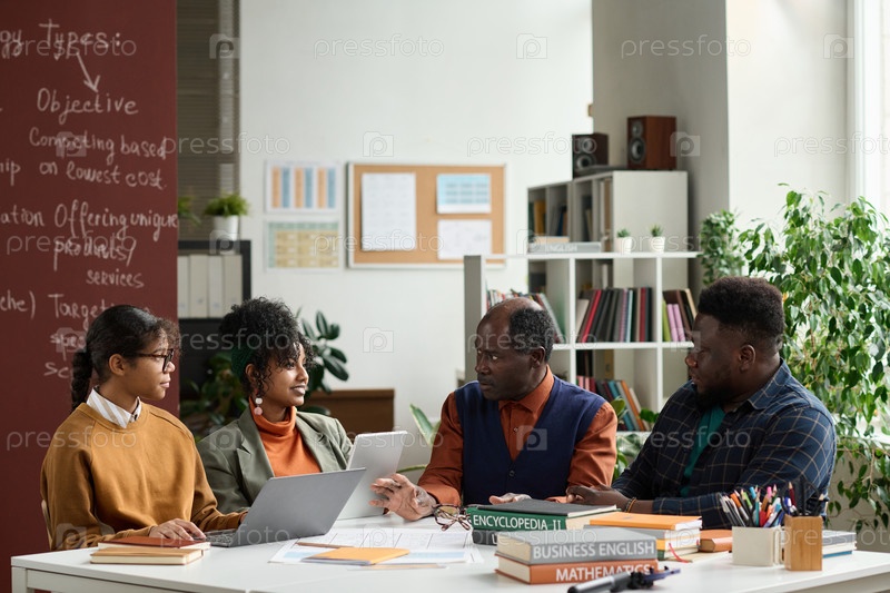 Черный старший профессор разговаривает с группой студентов в классе