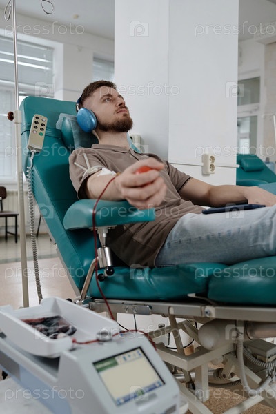 Молодой человек, сидящий в кресле во время переливания крови