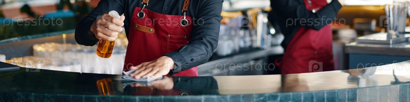 Бармен дезинфицирует барную стойку