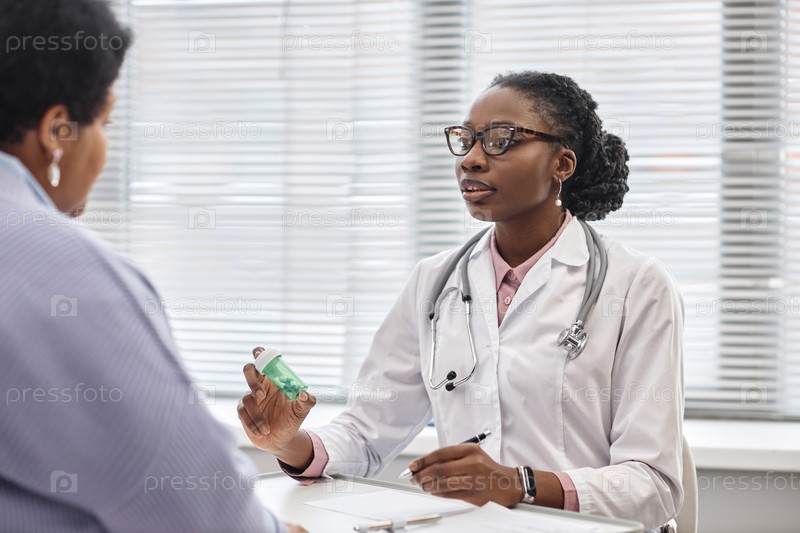 Женщина-врач, держащая бутылку с таблетками