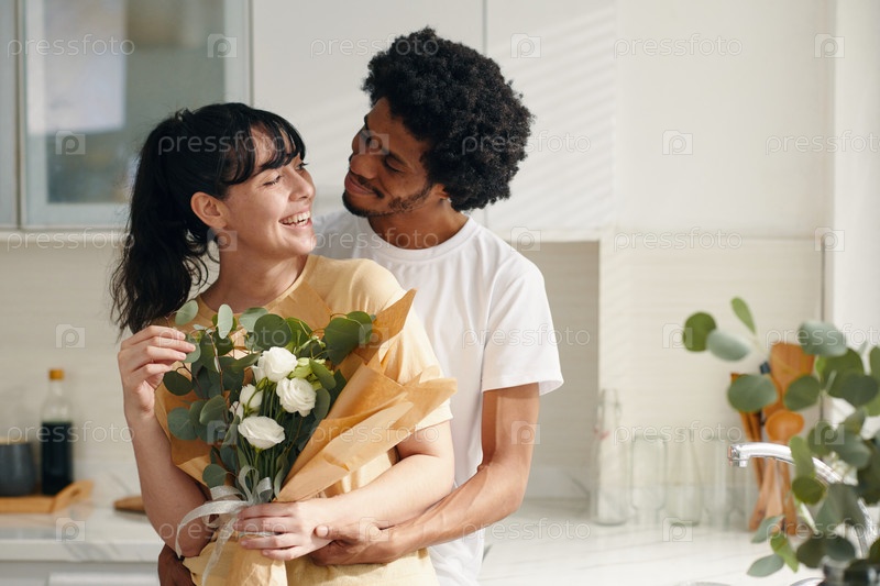 Женщина с цветами смотрит на мужа