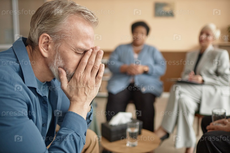 Плачущий старший мужчина в групповой сессии терапии