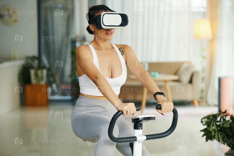 Женщина в гарнитуре VR Riding Exercise Bike