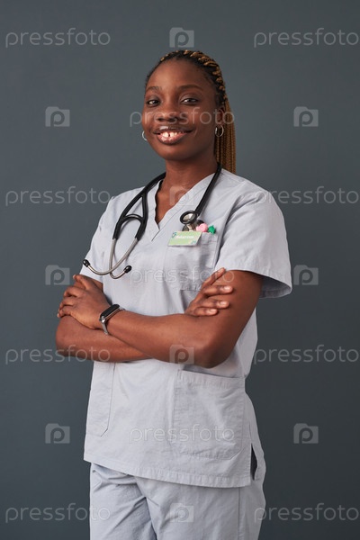 Молодая чернокожая женщина в роли медсестры, стоящей с перекрещенными руками
