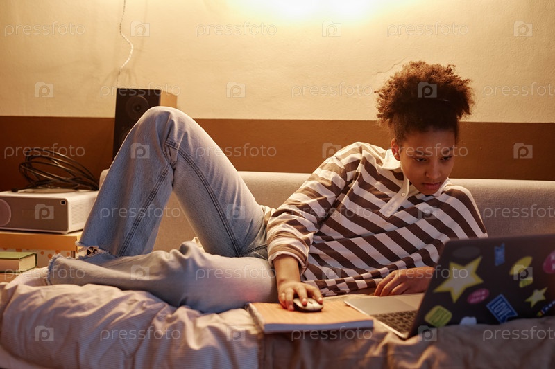 Черная девочка-подросток, лежащая на кровати и использующая ноутбук
