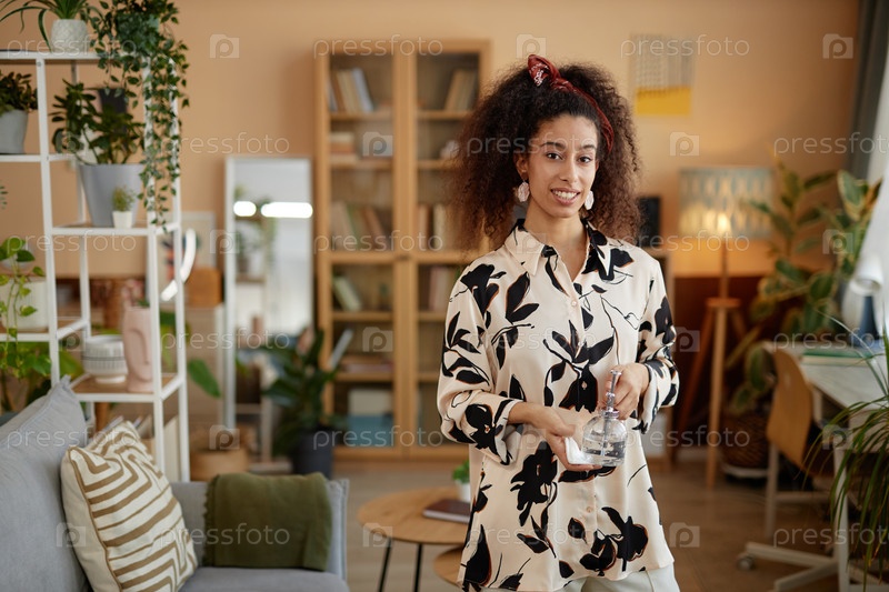 Молодая чернокожая женщина с кудрявыми волосами улыбается перед камерой дома