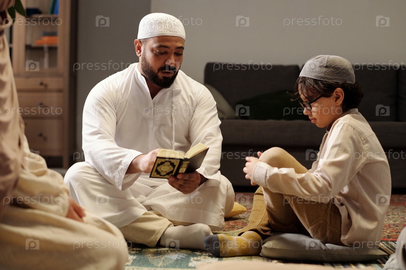 Мужчина, объясняющий суру Корана на семейном собрании