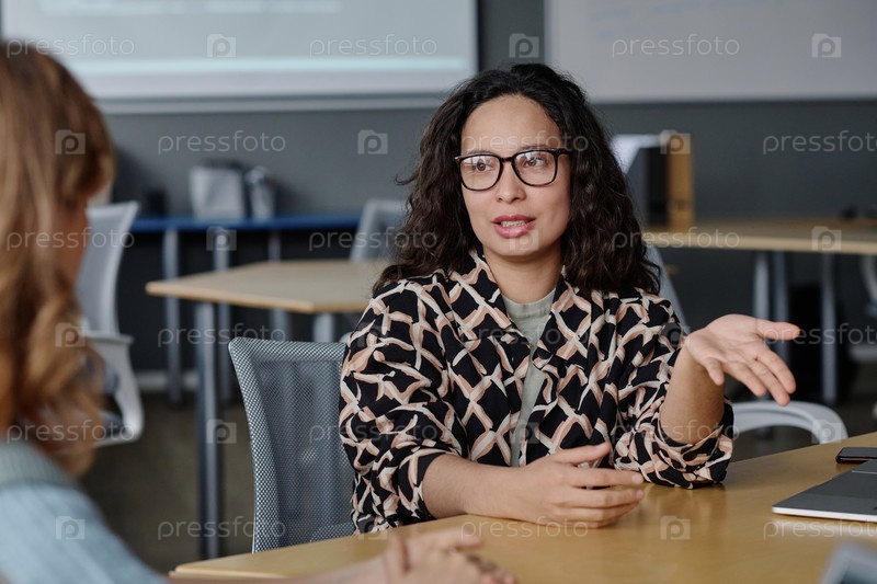 Молодая предпринимательница ведет разговор со своей коллегой в офисе