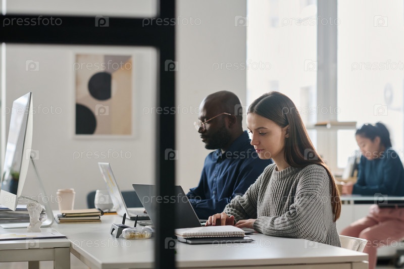 Разнообразные молодые люди работают на ноутбуках в офисе