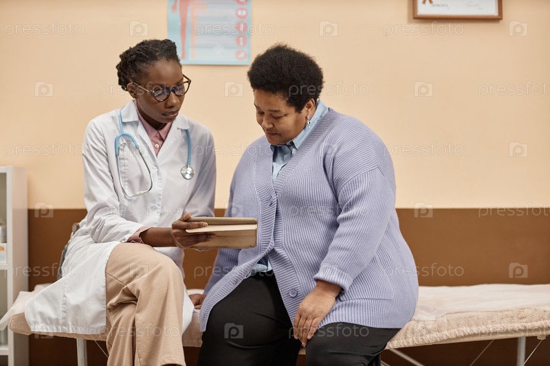 Практикующий врач показывает медицинский отчет лаборатории пациенту на планшете