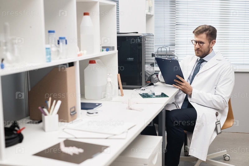 Инженер 3D-принтера с клипбором в лаборатории Мужчина
