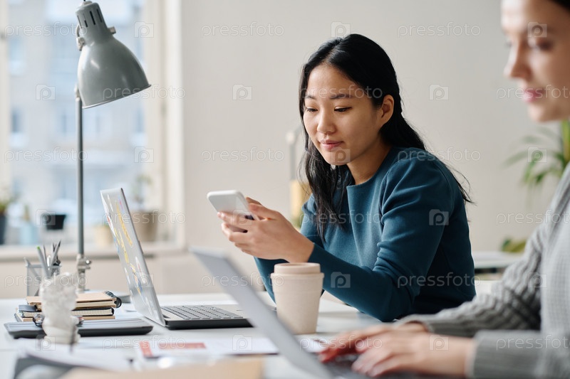 Азиатская женщина прокручивает веб-страницу на смартфоне