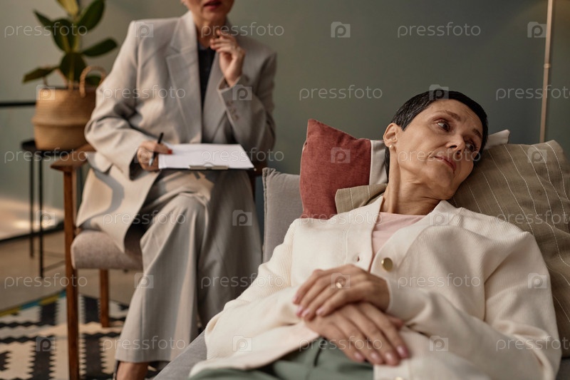 Зрелая женщина, лежащая на диване во время сеанса терапии