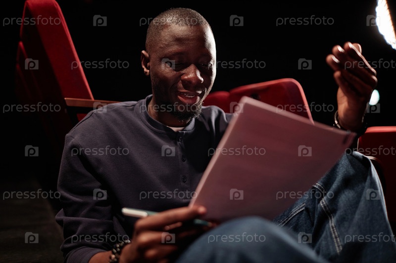 Улыбающийся чернокожий мужчина читает строки эмоционально