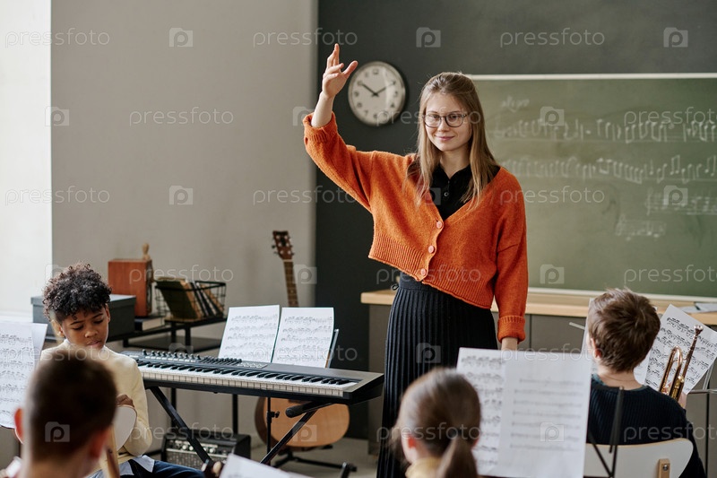 Молодой учитель дирижирует школьным оркестром
