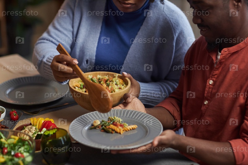 Близкий снимок чёрной семьи, обедающей вместе и сидящей за столом