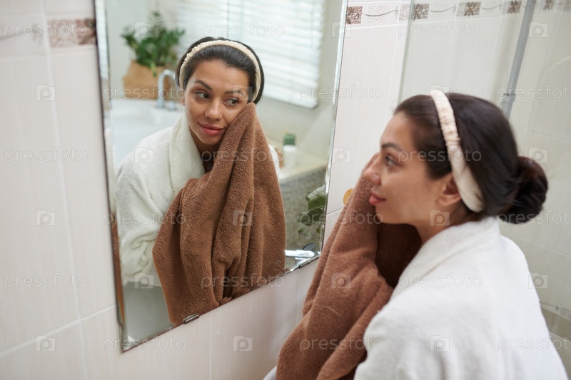Девушка касается чистого лица мягким полотенцем