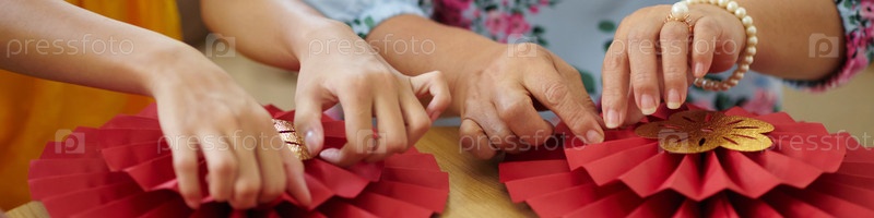 Заголовок с членами семьи, делающими вентиляторы на бумаге Tet