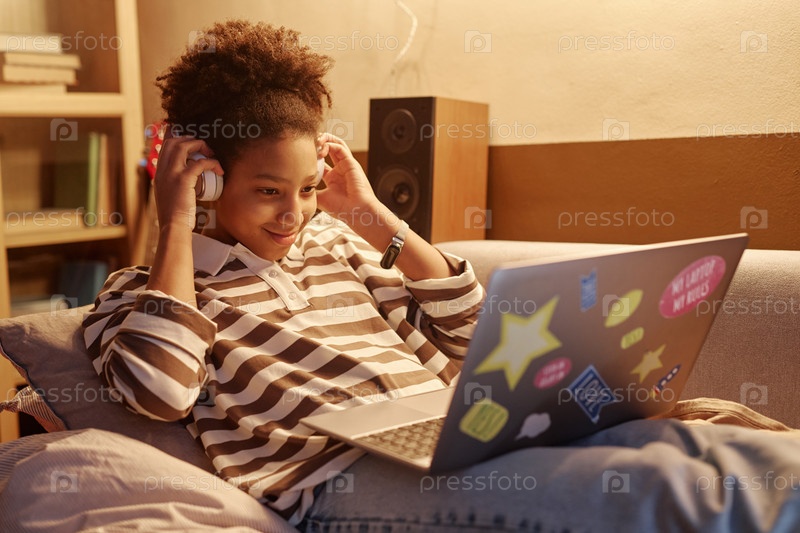 Улыбающаяся чернокожая девочка-подросток использует ноутбук с наушниками