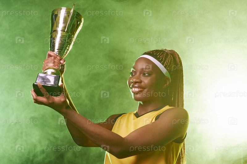 Улыбающаяся спортсменка держит трофей с зеленым дымом