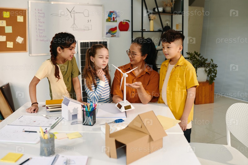 Школьные дети смотрят на небольшую ветряную турбину