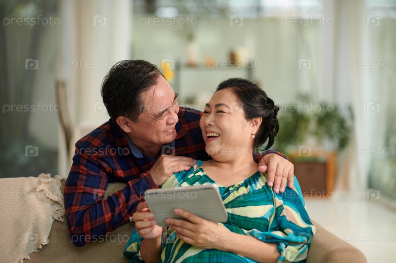 Веселая пара с планшетным компьютером