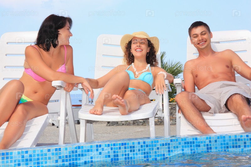 Мужчина и две молодые женщины лежат на шезлонгах около бассейна