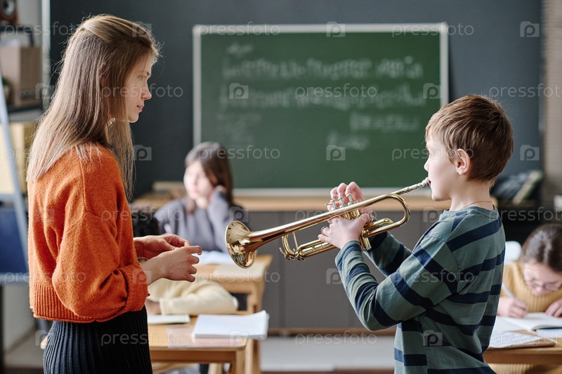 Мальчик играет на трубе в музыкальном уроке