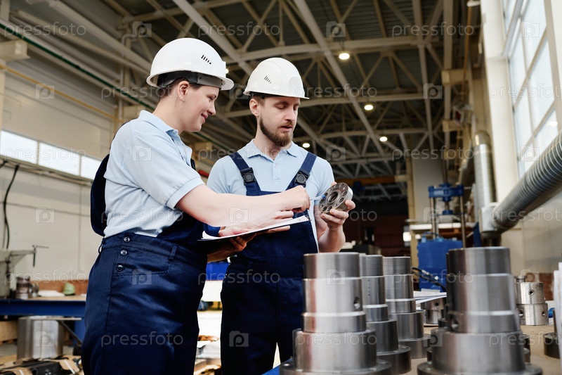 Два фабричных рабочего смотрят на металлический объект