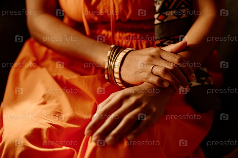 Руки женщины в платье и браслетах