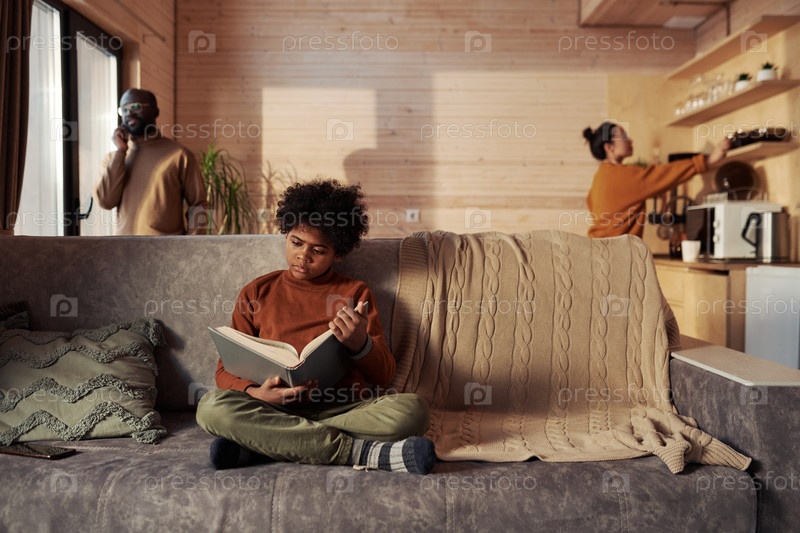 Серьезный мальчик читает книгу на диване