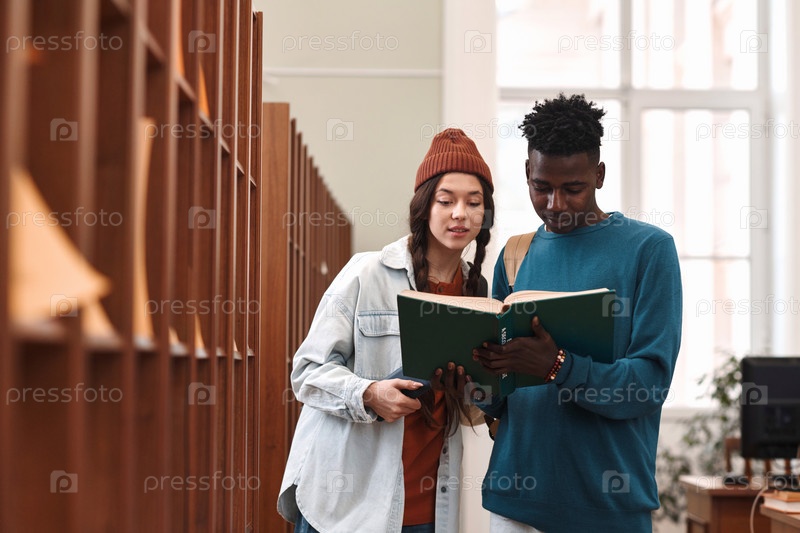 Молодой мужчина и женщина читают книгу, стоящие в библиотеке