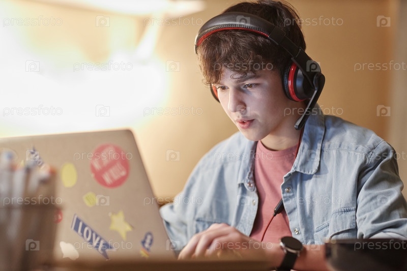 Подросток играет в видеоигры на ноутбуке с гарнитурой