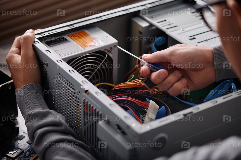 Техник, работающий над поврежденной системной единицей ПК Мужчина